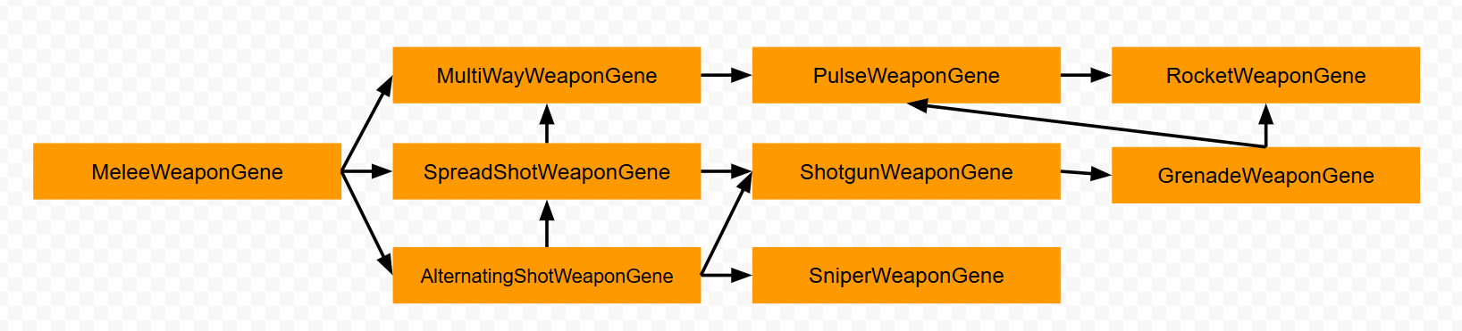 enemy evolution geaph: weapons Published September 17, 2016 at 1636 × 371 in making a procedurally generated game, what we learned (so far) The transition graph showing which weapon genes can spawn which.